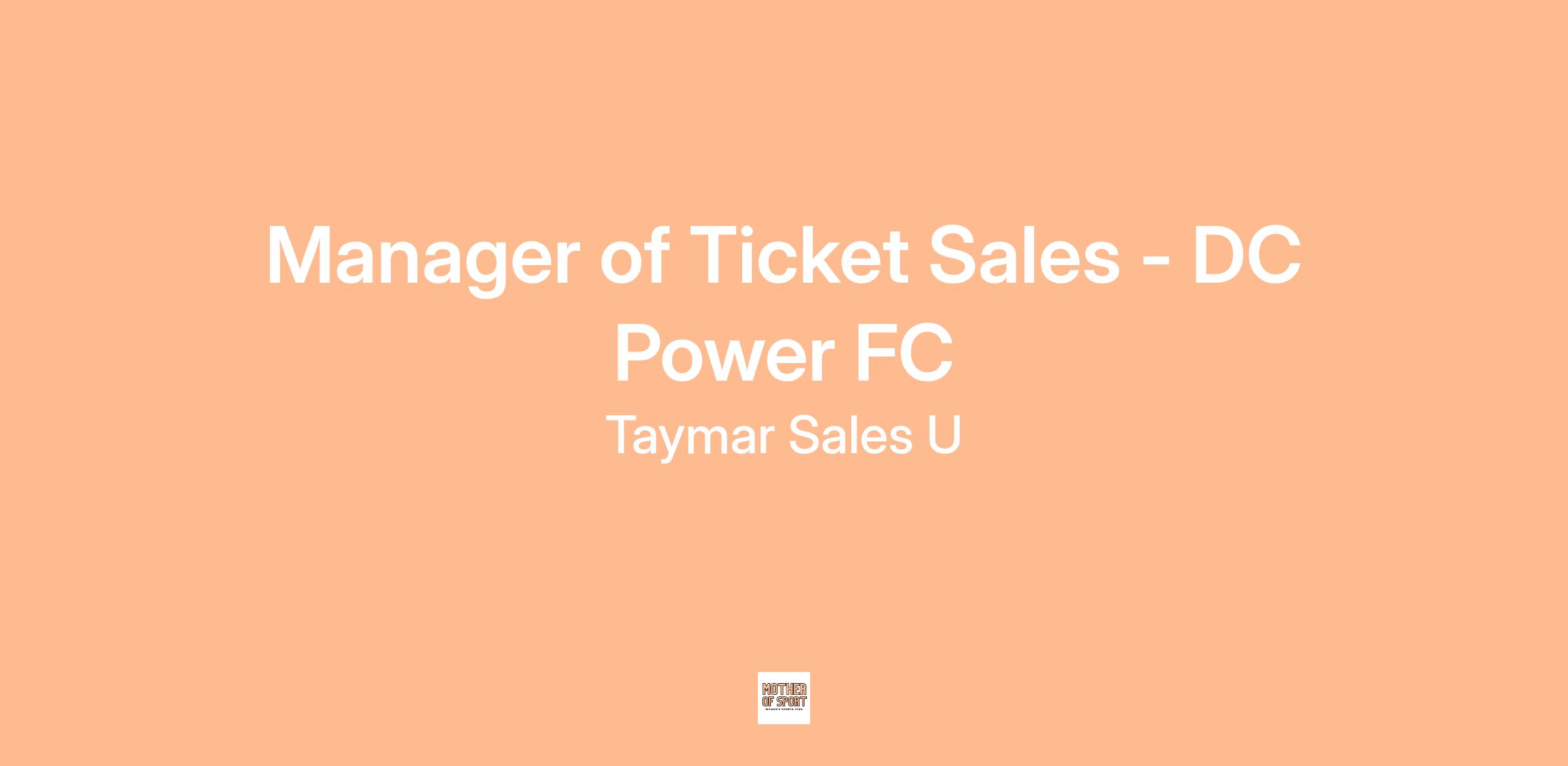 Position Overview: Taymar Sales Pro's Manager of Ticket Sales - DC Power FC position will be responsible for developing, building and leading all ticket sales strategy for newly launching Women's Super League club . This role will play a key role as a leader within Taymar Sales Pro and be tasked with building, deploying, and overseeing a comprehensive, year-round ticket sales strategy for DC Power FC Women's team, while recruiting, developing, coaching, and overseeing a team of high achieving ticket sales Account Executives. This role will be on the ground floor of launching a brand new Super League team, while also opening and selling within the D.C. market. The successful Manager will create and develop a comprehensive go to market strategy, work collaboratively with ticket operations, marketing and DCP senior leadership to maximize revenue through season ticket, group, premium and single game revenue.