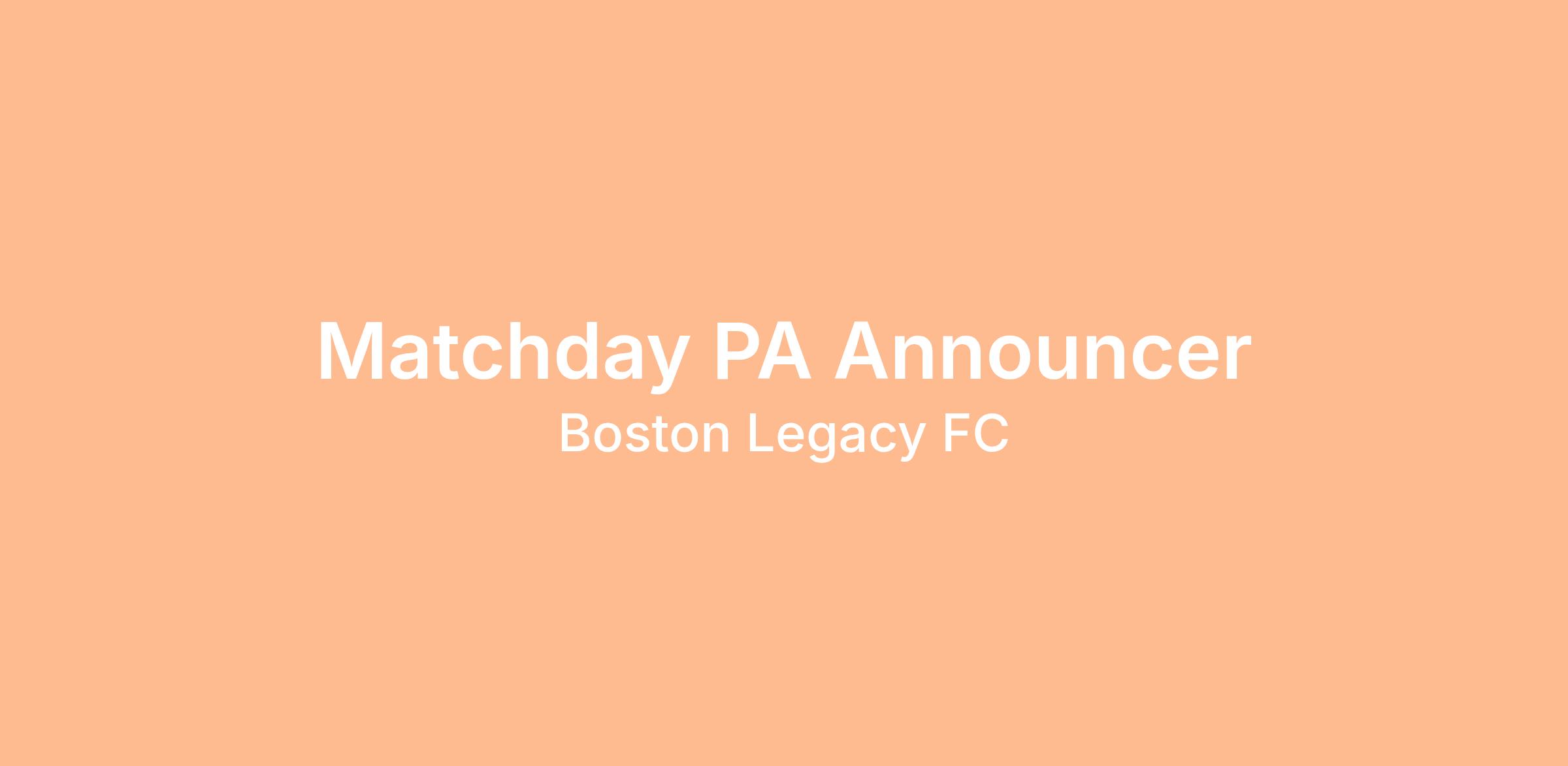 Boston Legacy FC is seeking a knowledgeable, high-energy matchday public address announcer to inform, engage, entertain fans throughout all home matchdays. The ideal matchday PA announcer should have an engaging stadium presence and be comfortable following a run of show with the ability to adapt on the fly.