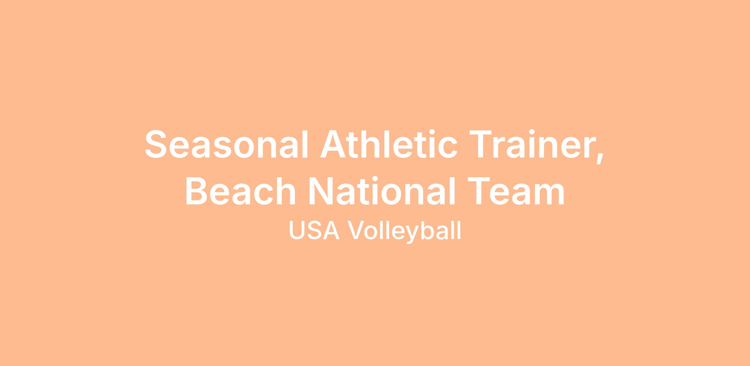 USA Volleyball seeks a Full Time Seasonal Assistant Athletic Trainer (ATC) from April through August to work within the Sports Medicine and Performance Division of the Beach National Teams Program (BNT). USA Volleyball’s interdisciplinary medical and performance team provides an excellent work environment while demonstrating a comprehensive approach to athlete care. The Seasonal ATC will be an integral member of this medical team and will report directly to the Head Athletic Trainer, BNT.